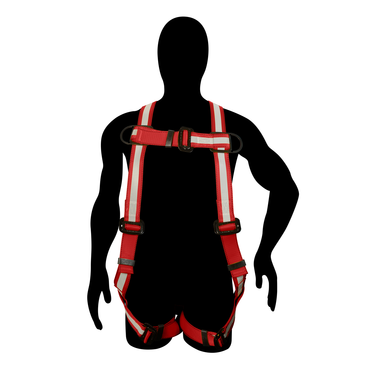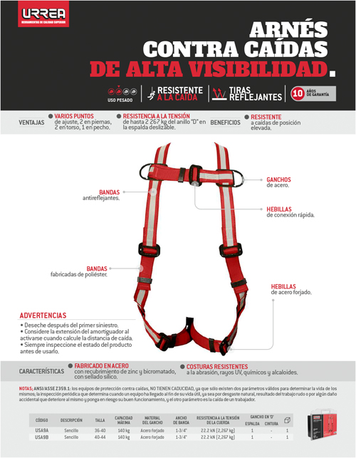 Capacidad máxima: 140 kg. Material de las bandas: poliéster. Numero de puntos de ajuste: 5 (2 en piernas, 2 en torso, 1 en pecho)