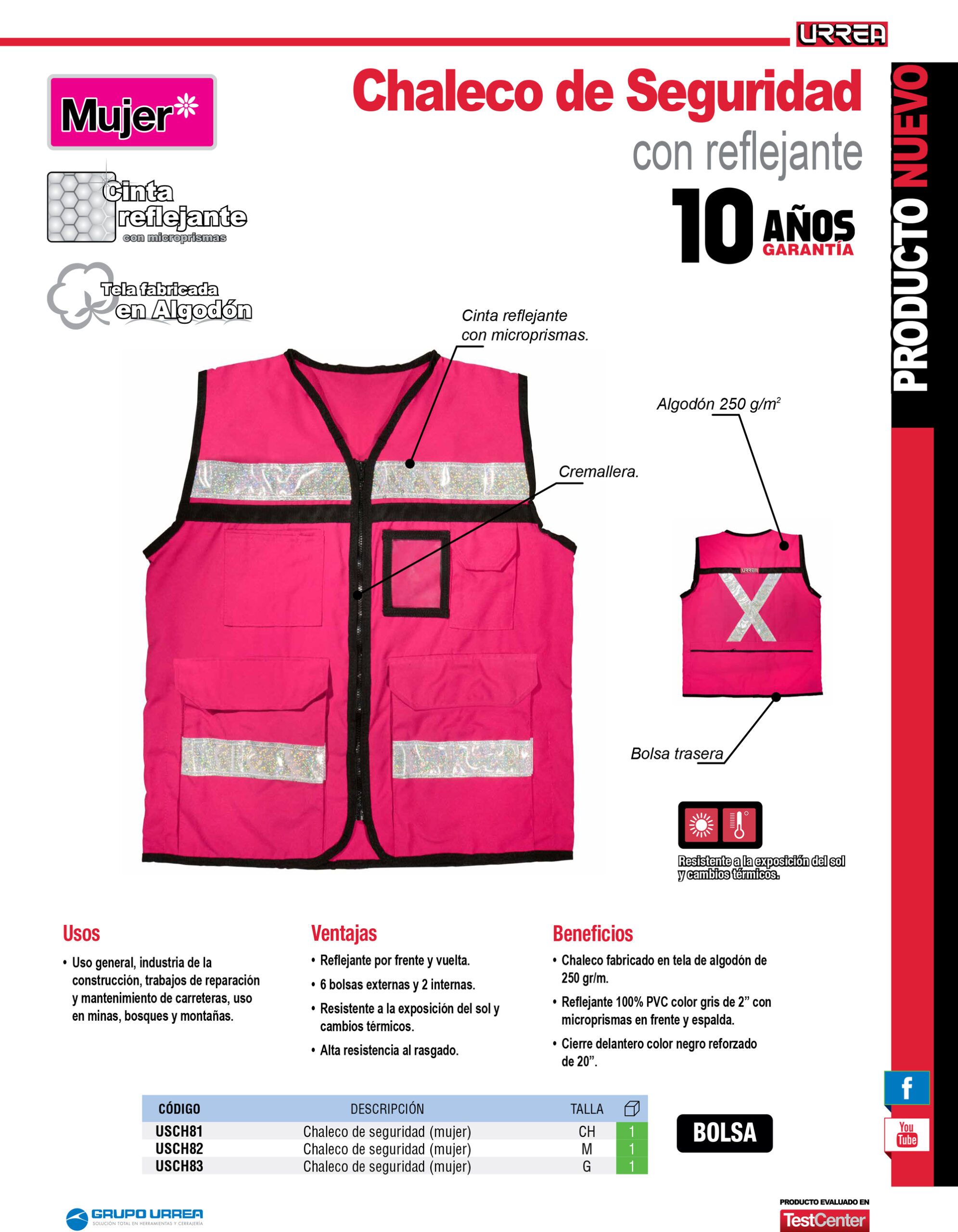 Reflejante en la parte frontal y en la espalda. Con 6 bolsas externas (incluyendo una en la parte de la espalda) y 2 bolsas internas. Tela resistente a la exposición del sol y cambios térmicos. Alta resistencia al rasgado.